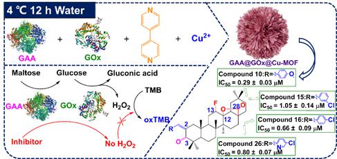 该论文首次将α-葡萄糖苷酶(GAA)和葡萄糖氧化酶(GOx)同时固定在Cu-MOF上制备出具有双功能的杂合酶-催化金属有机骨架反应器(GAA@GOx@Cu-MOF)用于α-葡萄糖苷酶抑制剂的筛选。所制备的反应器不仅具有与GAA-GOx-HRP相似的传感性能,而且对GAA抑制剂筛选具有良好的抗干扰性能和高灵敏度,阿卡波糖的检出限为7.05 nM。更重要的是,Cu-MOF可以有效地提高GAA和GOx的催化活性(较游离酶提高了约4.58倍),储存稳定性,热稳定性,化学稳定性,生物稳定性和可回收性,从而可大大拓宽酶的应用范围,使其不再局限于温和环境。另外,所提出的筛选策略具有极好的准确性,已成功应用于齐墩果酸衍生物作为潜在的抗糖尿病药物的筛选,并有望用于从天然产物中筛选α-葡萄糖苷酶抑制剂。总之,制备的杂合酶催化MOF反应器在筛选抗糖尿病药物方面具有很大的潜力。同时,这项工作也可为进一步研究多功能MOF复合材料提供一些见解和启示。论文链接://doi.org/10.1021/acsami.9b11754