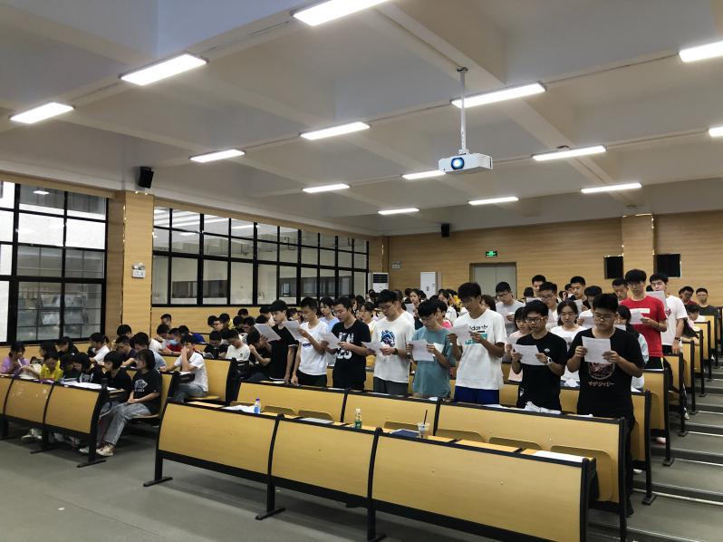 2020级本科新生辅导员黄文浩为新同学讲解学校资助政策和学生手册的内容,并安排以班级为单位诵读《“诚信考试,从我做起”自律承诺书》的相关内容,叮嘱同学们遵守校规校级,形成良好的学风,鼓励同学们用奋斗的青春砥砺前进。