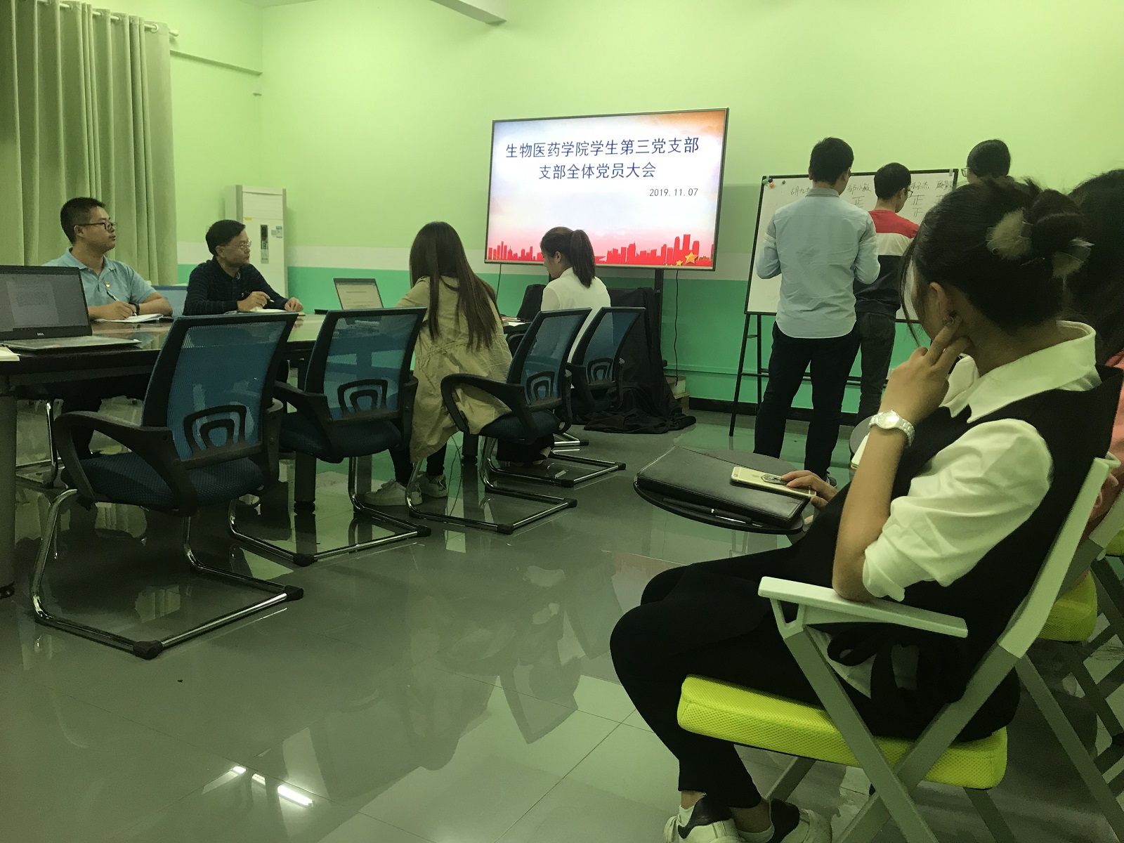 11月7日晚,漫蛙漫画 学生第三党支部在科技南楼407会议室召开党员大会,选举支部委员会委员。会议由支部书记胡九如主持,联系支部的学院党委书记徐向东同志到会指导。 大会按照《中国共产党章程》和《中国共产党基层组织选举工作暂行条例》进行学生第三党支部第一届委员会选举。大会通过了党支部委员候选人建议名单、《选举办法》、总监票人、监票人和计票人名单,按照无记名投票的方式差额选举产生了漫蛙漫画 学生第三党支部第一届委员会委员。 徐向东作了发言,他首先指出支部委员选举是支部建设的重要工作,对支部未来的发展起着奠定基础的作用。同时,他对支部近来的工作表示肯定,对选举产生的支部委员表示祝贺并提出四点希望,一是希望各支部委员认真讨论好分工,做好支部建设规划,继续开展好支部“不忘初心,牢记使命”主题教育;二是希望支部委员能严格要求自己,在支部做好示范引领作用;三是希望支委能够切实指导支部从政治建设、思想建设、组织建设、作风建设等方面积极开展党建工作。四是希望支部能在学校高水平建设过程中,结合学院特色,围绕粤港澳大湾区建设,打造支部建设的特色品牌,为学院学风建设、科研建设及人才培养起到支撑作用。