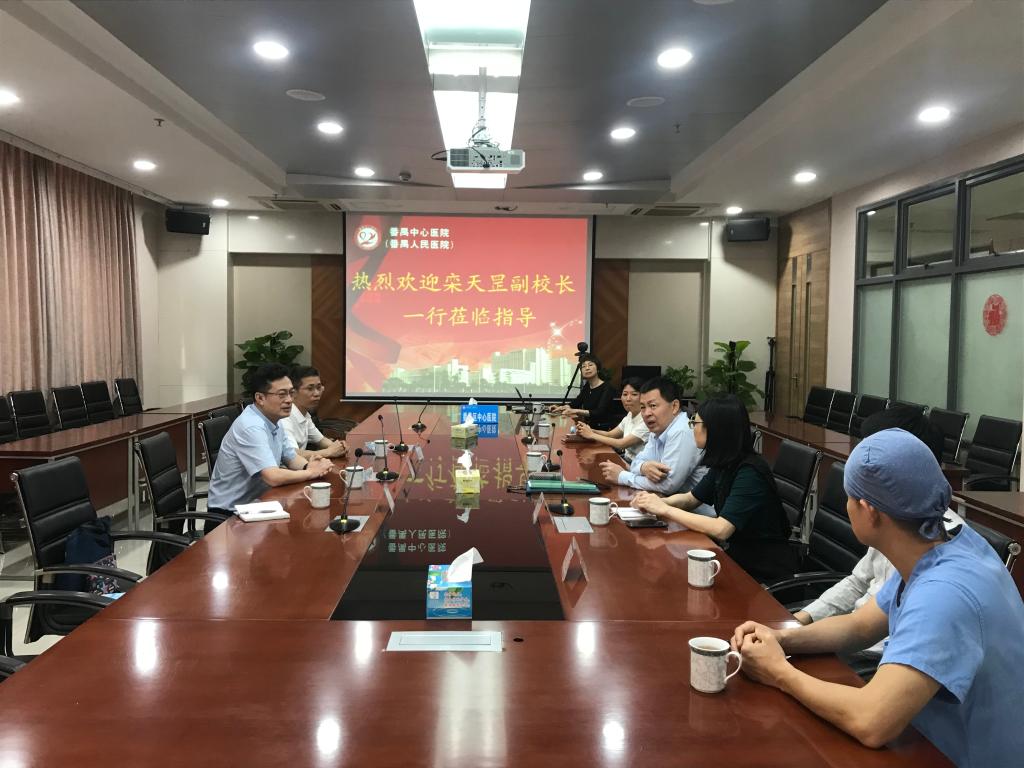 4月1日,学校党委常委、副校长栾天罡带队前往番禺中心医院(下简称中心医院)调研,漫蛙漫画 执行院长赵肃清陪同前往。中心医院党委副书记、副院长陈汉威、科教科科长张文洁及泌尿外科护士长莫绮珊等有关科室业务骨干热情接待了我校调研组一行。