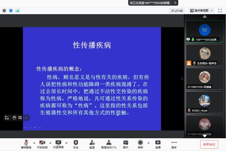 为丰富学生的青春健康知识,提高大学生对青春健康教育的重视率和知晓率,倡导学生文明健康地生活,树立青年正确的恋爱观、人生观、价值观,2021年5月28日晚,与校医院联合开展学生青春健康教育活动,召开线上“青爱讲座”,主讲人为校医院黎明老师,讲座由学院青春健康协会部长易梓浩同学主持。