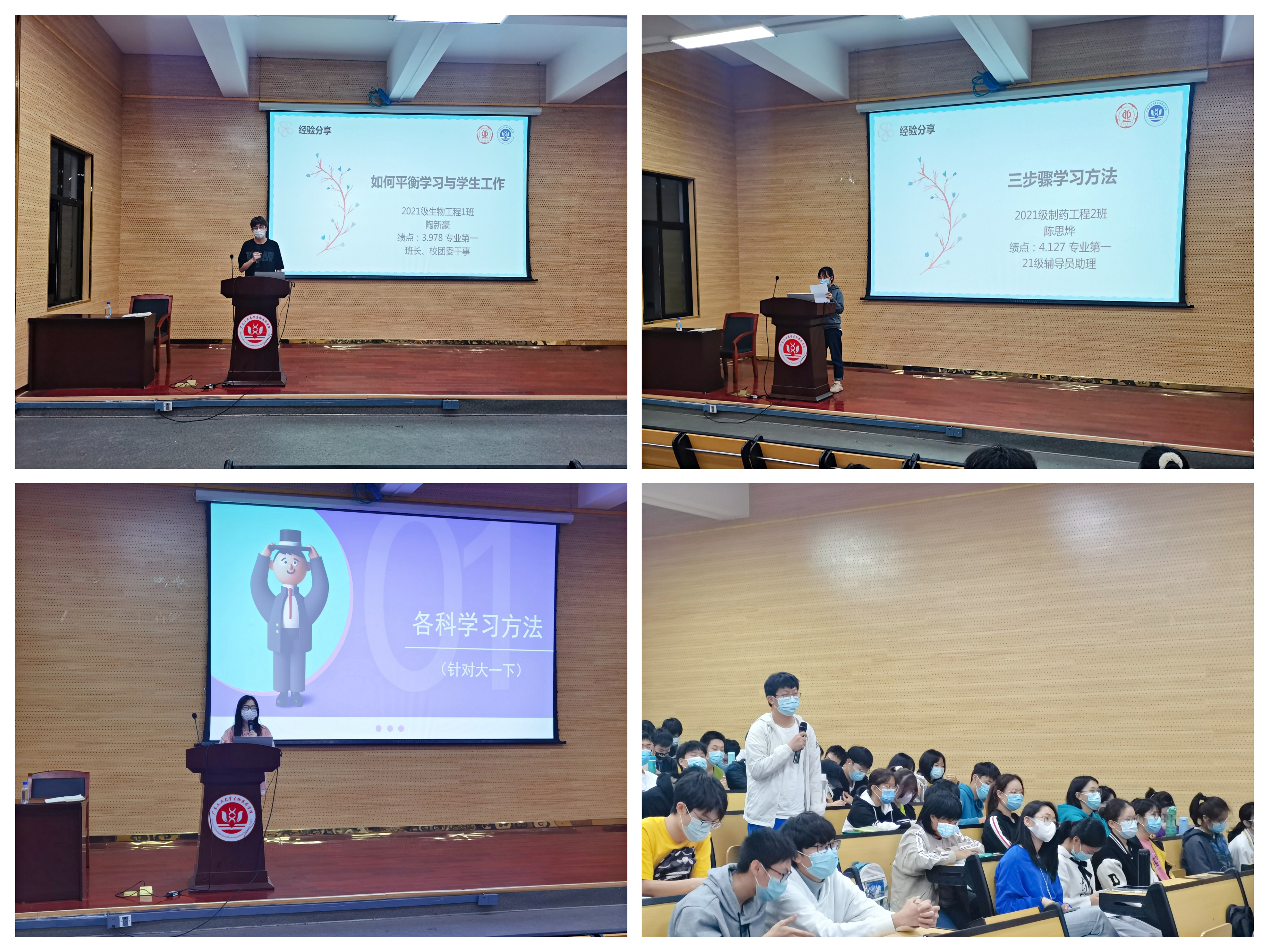 会上,邀请了三位同学分享交流学习经验。2019级王美静同学介绍了各科学习方法与建议,以及实验室和“互联网+”、“挑战杯”等比赛的相关信息,并回答了21级同学关于专业和考研的问题;陈思烨同学分享了三步学习法,从课前、课中、课后三方面谈自己的学习感悟;陶新豪同学以自身经验为例,分享了如何平衡学习与学生工作。充分发挥优秀同学的榜样引领作用,激励同学们与榜样对标、锐意进取。