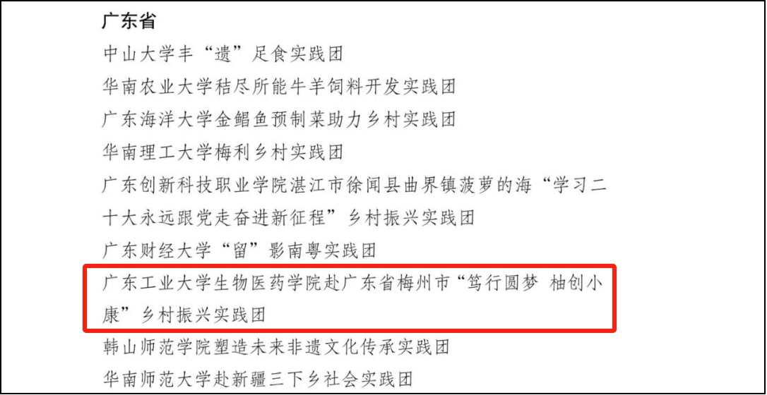 同时,团队也入选全国大中专学生“三下乡”社会实践活动之乡村振兴“笃行计划”专项行动全国示范性团队、广东省首批“百千万工程”突击队示范项目和2023年广东大中专学生志愿者暑期文化科技卫生“三下乡”社会实践“优秀品牌项目”(100个)。