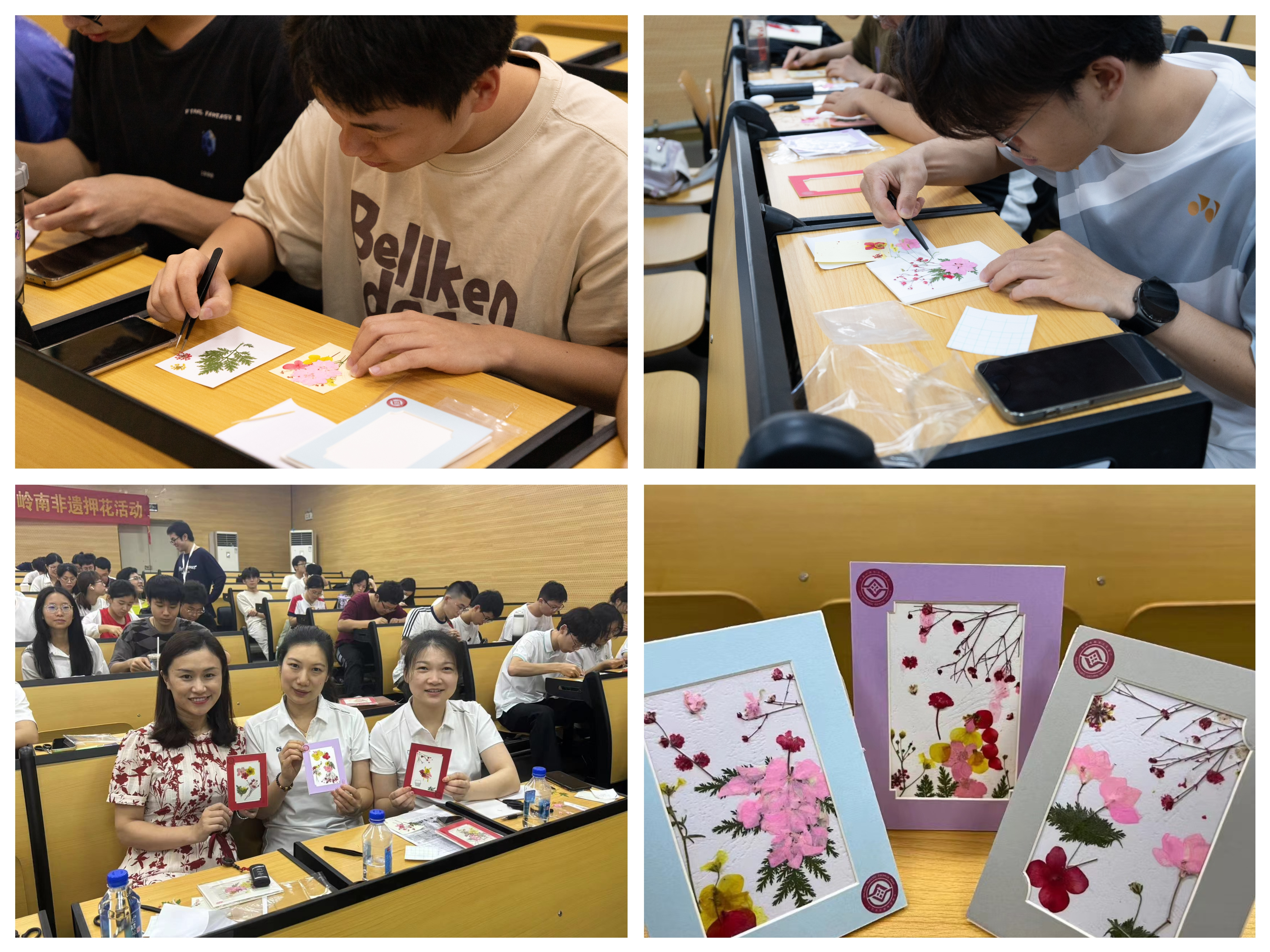 “当窗理云鬓,对镜贴花黄。”李丽坚引用《木兰辞》中的经典诗句,向同学们普及花的历史,以及广州这座花城城市如何与花结缘,由点到面,通过一幅幅优美的押花作品向学生介绍押花艺术。她提到,押花技艺历久弥新,在当前已经被赋予了新的时代内涵,有着丰富的价值。在实践环节,同学们专心致志地制作自己的作品,爱绿护绿,小心翼翼地将绿叶与鲜花定格在此刻,感受绿美,并在完成后满心欢喜进行分享。