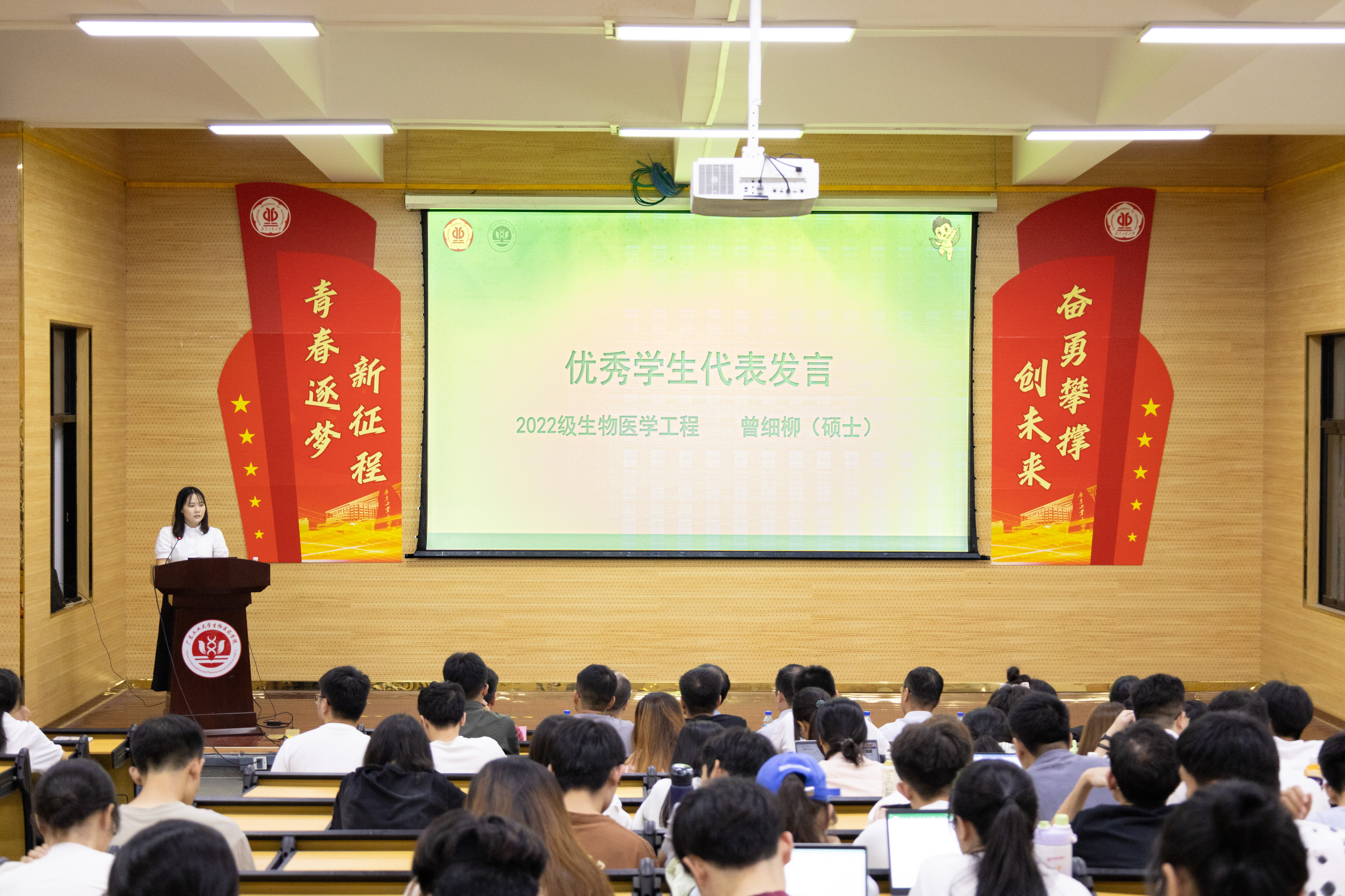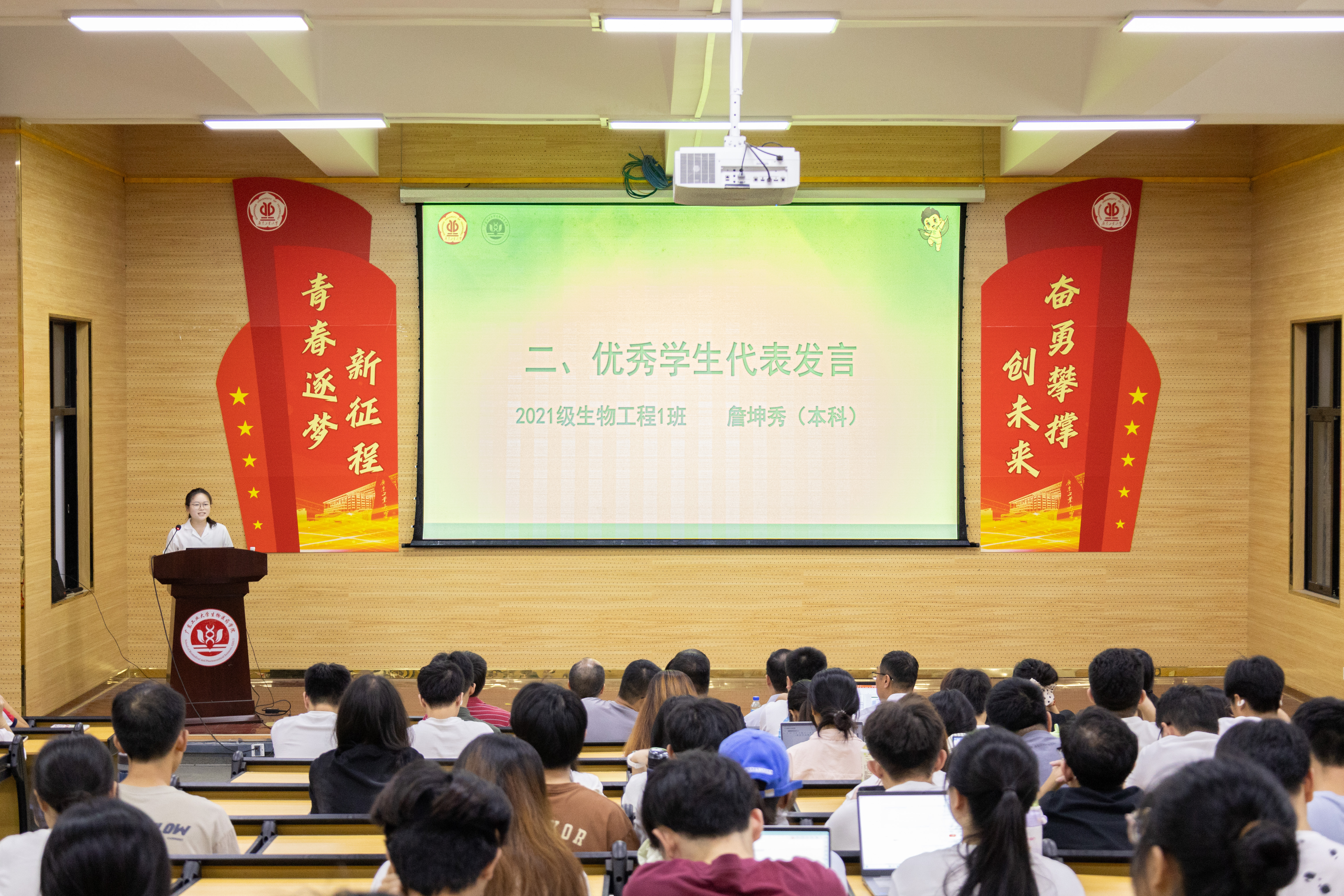 获奖代表2021级生物工程1班詹坤秀同学和2022级生物医药工程硕士曾细柳同学分别作为本科生和研究生代表进行分享,她们表达了对广州天润药业有限公司的感谢,并表示要珍惜这份荣誉,将其转化为前进的动力,时刻保持谦虚谨慎的态度,继续发扬勤奋学习、刻苦钻研的精神,不断提升自己的专业素养和综合素质,努力成为对社会有用的人才,决心以优异的成绩和良好的品德,回报社会,服务人民,为祖国的繁荣富强贡献自己的力量。