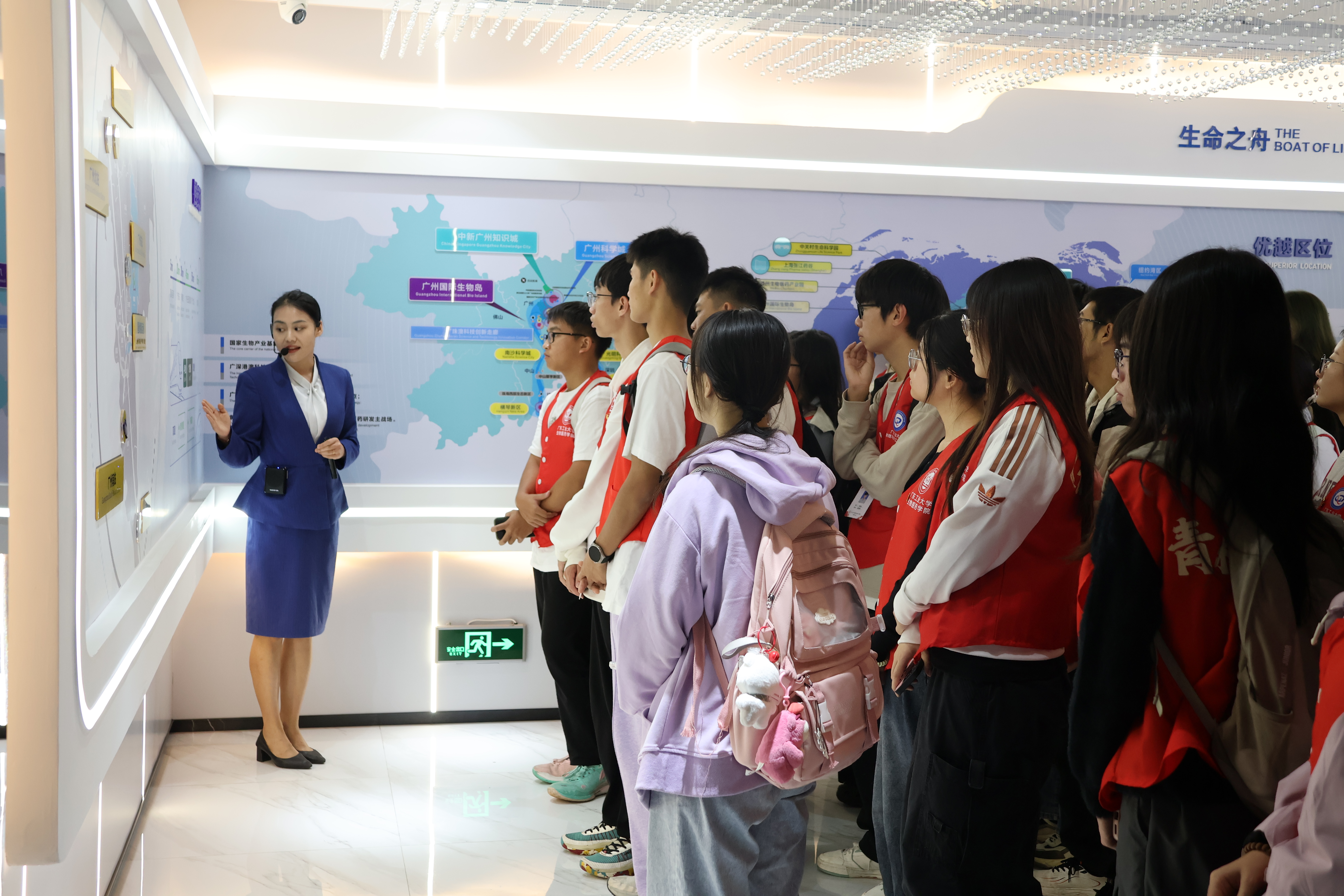 广州国际生物岛是国际性的生物技术研究及生产基地,其主要产业发展方向为生物新药创制、生物能源、生物信息、基因工程与蛋白质工程和海洋生物等方面的研发。学员们在讲解员的带领下参观了生物岛展厅,大家从信息化的介绍中直观地了解到生物岛的历史变迁和人才的聚集,了解到其“一核两极”高端生物医药产业空间布局和“一岛多园”政策先行先试集聚区中的核心引擎,并把人才链与产业链相结合达到同频共振。