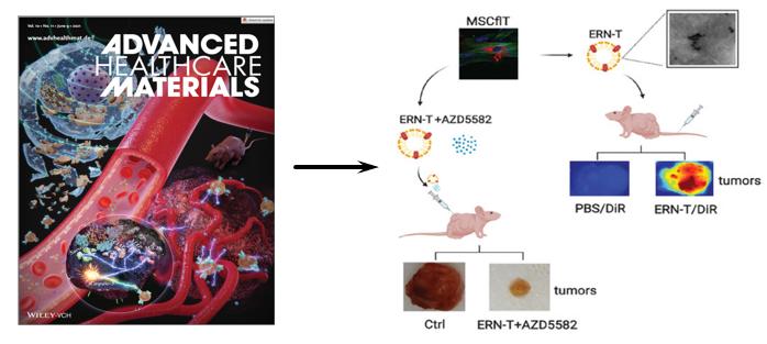 本文针对重组型促凋亡因子TRAIL临床表现出的肿瘤耐药性、半衰期短和靶向性差等缺点,研发了一种新型的MSC干细胞内质网来源的抗癌TRAIL纳米药物(ERN-T)。数据揭示:该生物纳米药物ERN-T具有良好的肿瘤靶向性,当其与一种小分子的凋亡抑制因子(IAP)的拮抗剂(AZD5582)联用时,在体外和体内都表现出良好的特异性促癌细胞凋亡协同效应,因而潜在地可成为一种新型的高效且安全的癌症治疗纳米药物。该研究得到审稿人的高度认可,被推荐作为VIP论文发表,有幸被编辑选为该刊2021年6月刊的封面文章。