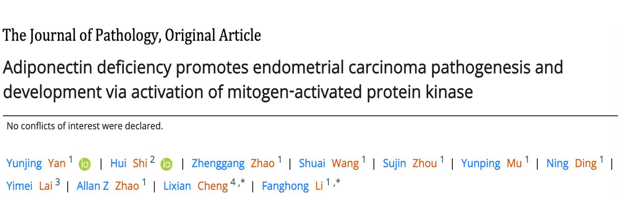 近日,漫蛙漫画 赵子建/李芳红团队在医学国际著名期刊《The Journal of Pathology》(IF=7.99,医学1区,Top期刊)上发表了题为“Adiponectin deficiency promotes endometrial carcinoma pathogenesis and development via activation of mitogen‐activated protein kinase”的学术论文。论文第一作者为漫蛙漫画 重大慢性疾病与创新药物研究所在读博士生闫云静,通讯作者为李芳红教授及程丽宪博士。